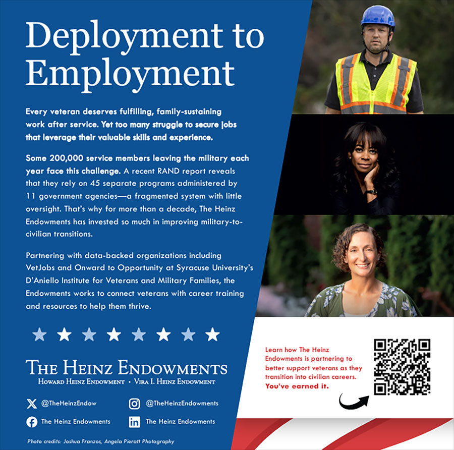 The Endowments’ Veterans strategy is based firmly on the evidence emerging nationwide: that the veteran population is overwhelmingly comprised of service-minded, talent-rich people who are assets to their communities and who leave the military with the ability to be immediately successful as civilians. In southwestern Pennsylvania, more than 140,000 veterans — about 35,000 of whom are post-9/11 service members — are highly-skilled yet undervalued assets in our region. The Endowments’ goal is to improve reintegration outcomes for veterans and their families and leverage their wealth of experience and knowledge for the good of the Pittsburgh region.